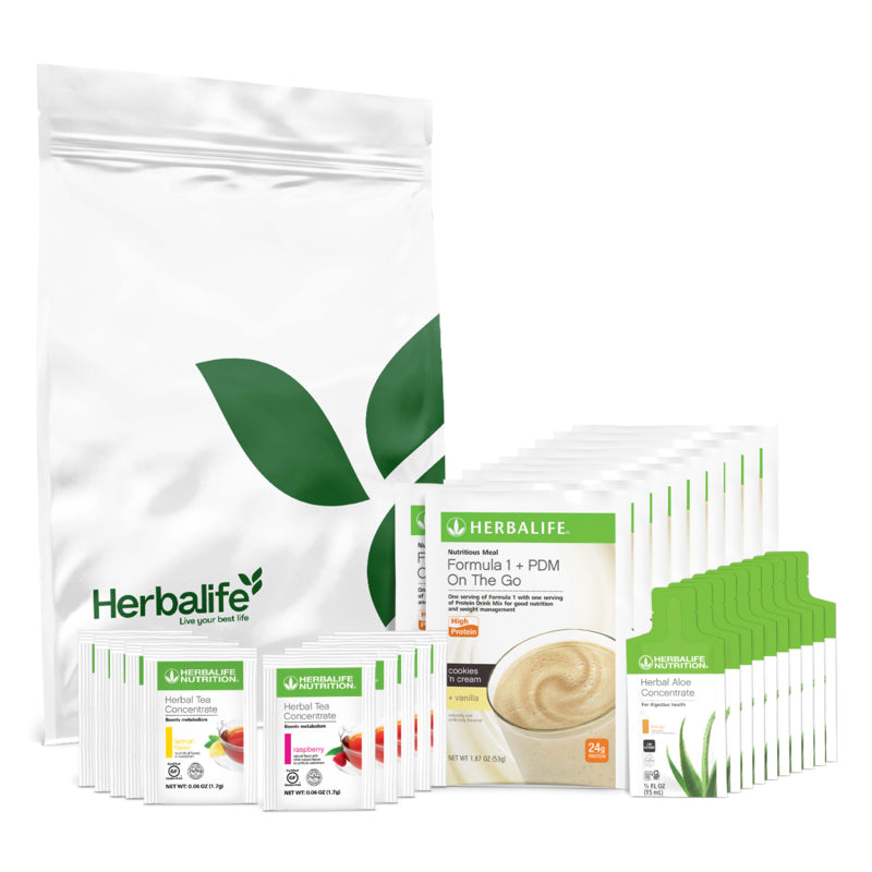Your feel-good products are here! The Classics On-the-Go Kit is packed with the most popular, delicious and nutritious Herbalife ® products, ideal for supporting your goals. Whether it’s managing your weight, supporting digestion or energizing your routine, these portable packets are the perfect fit for your on-the-go lifestyle. Key Benefits Enjoy more energy and sustain lean muscle with 24 g of high-quality protein per serving from Formula 1 Healthy Meal Nutritional Shake Mix and Protein Drink Mix Jump-start thermogenic (metabolic) activity and get antioxidant support with Herbal Tea Concentrate *† Support nutrient absorption and digestive function with Herbal Aloe Concentrate Fast Facts † Herbal Tea Concentrate provides 85 mg of caffeine per serving. It is recommended that products containing caffeine be used by healthy adult consumers and not recommended for those sensitive to caffeine. Pregnant or nursing women, individuals with medical conditions, or those taking medications should consult with a health care professional before use. Usage Blend or stir one packet of Formula 1 + PDM On The Go with 8 oz. of water or nonfat milk Add one serving of Herbal Tea Concentrate to 6 to 8 fl. oz. of hot or cold water Mix one packet of Herbal Aloe Concentrate with 6 to 8 fl. oz. of cold water *Caffeine is known for its natural thermogenic (metabolism-boosting) benefits and green tea for its antioxidant properties.